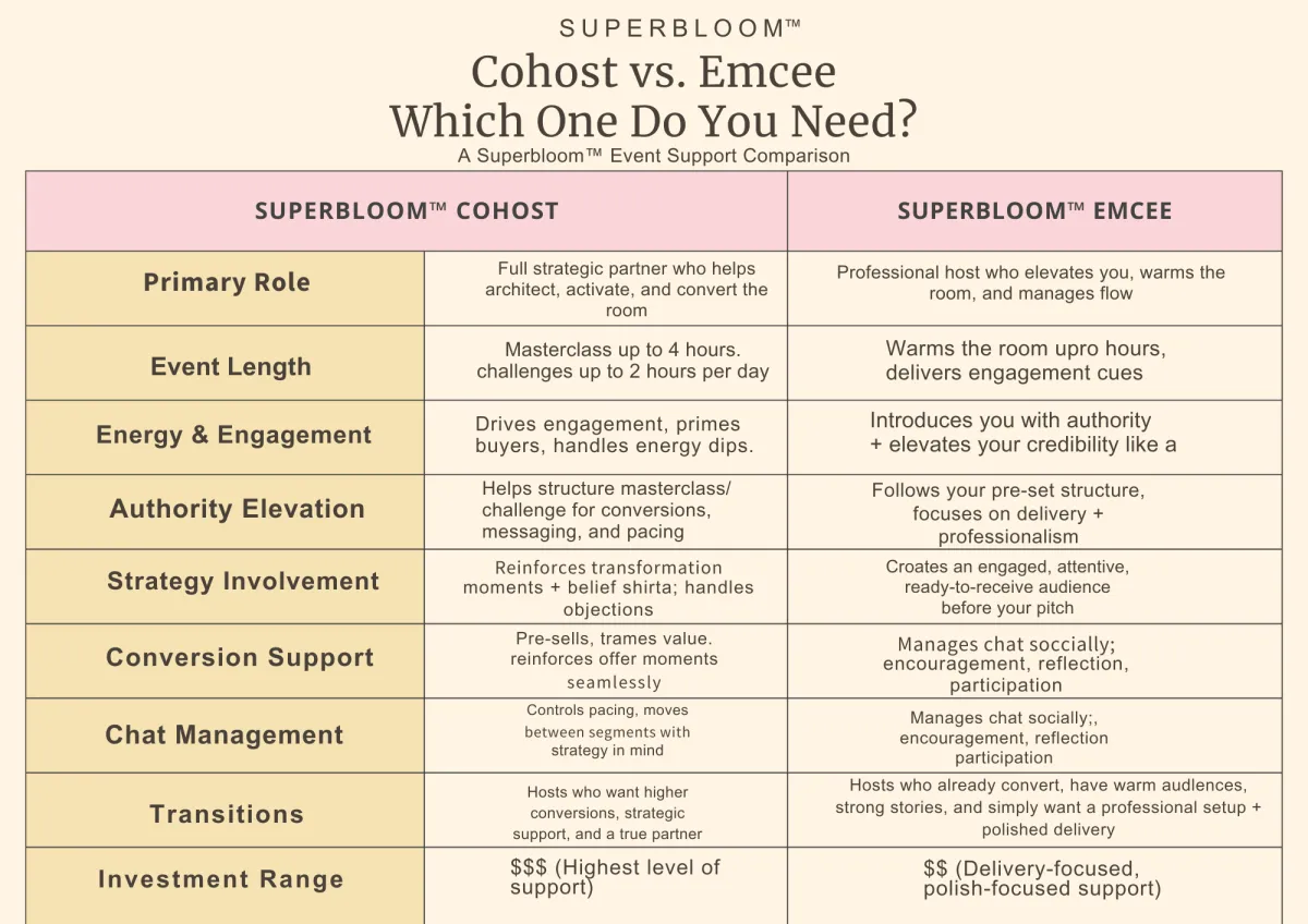 If you want to create a high-ticket offer, fill your room, host irresistible masterclasses, build authority, or scale with virtual events… you’re in the right place. This is your Superbloom™️ Season — where clarity meets confidence, and momentum meets money.